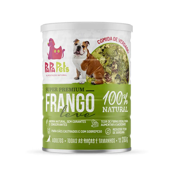 Alimentação natural em lata para cães. Alimento completo e balanceado, com vitaminas eminerais. Sabor frango leve, monoprotéico e com ingredientesselecionados. Ideal para cães com necessidade de redução ou controle de peso.