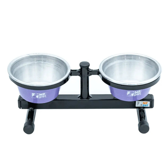 Comedouro Premium NF Pet LilásO Comedouro Premium NF Pet Lilás é um comedouro duplo suspenso com regulagem de altura, dando bastante conforto ao pet na hora da alimentação.Possui base de aço (com pintura eletrostática craqueada) e bacias em alumínio (que podem ser pintadas ou não). Produto de extrema resistência, muito duradouro, de design diferenciado, este comedouro foi pensado para os donos de pet que preferem manter a ração e a água separados. Como tem base elevada do chão, leva melhores condições de saúde e higiene para o animal.O recipiente pode ser retirado da base proporcionando fácil higienização.Tamanhos disponíveisFilhote – Capacidade: 500 ml (Não possui ajuste de altura)Mini – Capacidade: 1,20 L (0,6 cada) / Altura min.: 14 cm Altura máx.: 19,5 cmPequeno – Capacidade: 3 L (1,5 L cada) / Altura min.: 24 cm Altura máx.: 37 cmMédio – Capacidade: 5 L (2,5 cada) / Altura min.: 30 cm Altura máx.: 47 cmGrande - Capacidade: 7,2 L (3,6 cada) / Altura min.: 34 cm Altura máx.: 53 cm