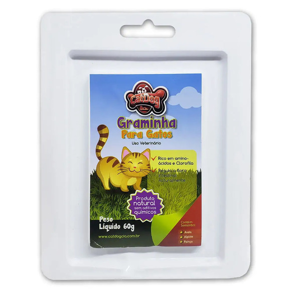 Descrição A Graminha para Gatos 60g - CatDog, auxilia o pet a eliminar as bolas de pelo regula o aparelho digestivo e intestinal   Dica Produto pode ser oferecido aos pets a partir dos 3 meses de idade, podendo ser consumido à vontade. Atenção: Este produto não substitui alimento completo.   Especificações Indicação                                                            Gatos Idade                                                                 Filhotes, Adultos, Idosos Dimensões da embalagem                                    Comprimento: 15cm Largura: 12cm Altura: 4cm Peso Aproximado                                                 60g Marca                                                                 CatDog
