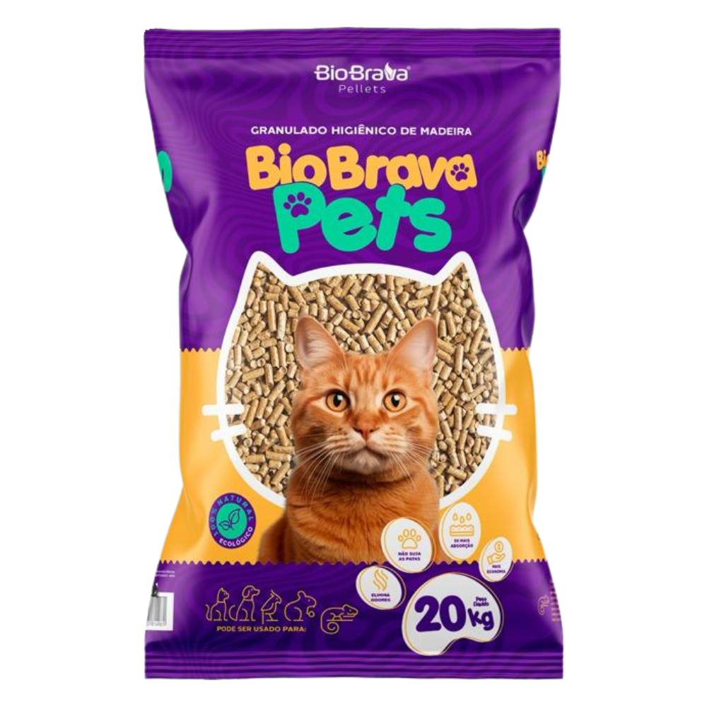 Produto prático e eficiente para higiene do seu gato, o granulado BioBrava de 20kg oferece controle e conforto no ambiente.