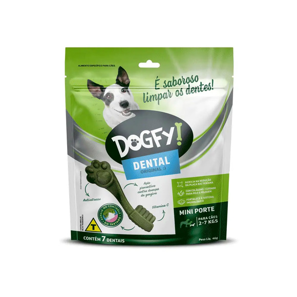 Petisco Dogfy Dental para Cães de Porte MiniO Petisco Dogfy Dental para Cães de Porte Mini é livre de corantes artificiais, possui uma textura exclusiva e é a solução diária de vitamina C com colágeno e imunoglobulina (proteína que fortalece o sistema imunológico).A exclusiva textura micro porosa foi desenvolvida com hexametafosfato, um composto funcional, que auxilia na limpeza profunda dos dentes, redução de placa, prevenção de doenças da gengiva e no controle do tártaro.Na você encontra a maior variedade de snacks como o Petisco Dogfy Dental para Cães com preço especial. Compre pelo site, app ou em uma de nossas lojas.7 Benefícios para limpeza e proteção:Auxilia na redução da placa bacteriana.Auxilia no controle do tártaro.Ação preventiva contra doenças da gengiva.Elevado teor de colágeno.Vitamina C + Imunoglobulina.Fortalece o sistema imunológico.Antiestresse.Ingredientes:Farinha de vísceras de aves, ovo em pó, fibra de colágeno (3,25%), farinha de batata doce, amido de milho*, farinha de trigo, lecitina de soja, hexametafosfato de sódio (0,06%), ácido ascórbico (Vitamina C), glicerina, goma xantana, propionato de cálcio, hidrolisado de fígado de suíno, sorbato de potássio, amarelo tartrazina, amarelo crepúsculo, azul brilhante e caramelo IV.* Contém, na composição, ingrediente geneticamente modificado: milho*.Espécies doadoras de gene: Bacillus thuringiensis e/ou Agrobacterium tumefaciens e/ou Streptomyses viridochrmesenes e/ou Zea mays.Níveis de Garantia:Umidade (máx.)150 g/kg11,00%Proteína Bruta (mín.)70 g/kg7,00%Extrato Etéreo (mín.)3000 mg/kg0,30%Matéria Fibrosa (máx.)10 g/kg1,00%Matéria Mineral (máx.)40 g/kg4,00%Cálcio (máx.)20 g/kg2,00%Cálcio (mín.)3000 mg/kg0,30%Fósforo (mín.)500 mg/kg0,05%Enriquecimento Mínimo por Kg:Vitamina C: 350mg/kgQuantidade recomendada:Até uma unidade por dia.Modo de conservação:Deve ser mantido em local seco e arejado. Após aberto, consumir o produto em até 3 dias.