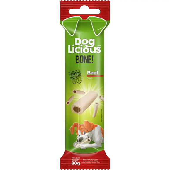 Petisco DogLicious Bone CarneO Petisco DogLicious Bone Carne é um alimento específico para cães adultos. Ajuda no controle do tártato, enquanto o seu pet rói o petisco.Quer uma opção saborosa para divertir e ainda cuidar dos dentinhos dele? DogLicious Bone Beef contribui para o cuidado oral diário, ajudando a manter os dentes limpos. Além disso, proporciona momentos de diversão, ocupando mais tempo do seu amigo!Prepare-se para um petisco que vai deixar seu cão com água na boca. DogLicious T-Bone é delicioso! Um petisco macio, irresistível e com um formato suculento. Com essa companhia, suas brincadeiras ganham um sabor repleto de diversão.Na , você encontra o Petisco DogLicious Bone Carne com preço especial. Este produto não substitui o alimento completo, manter em lugar seco e ventilado, e uso proibido na alimentação de ruminantes.IngredientesArroz quebrado, Farinha de vísceras de aves, Amido de mandioca, Farinha de trigo, Óleo de soja degomado, Aditivo palatabilizante à base de frango, Hexametafosfato de Sódio (0,6%), Celulose em pó, Goma acácia, Açúcar, Cloreto de sódio (sal comum), Glicerina, Propilenoglicol, Sorbato de potássio, Cloreto de potássio, Ácido fosfórico, Propionato de cálcio, Aroma artificial de carne (0,05%), Corante natural caramelo, Dióxido de titânio, Aditivos antioxidantes (BHA, BHT).