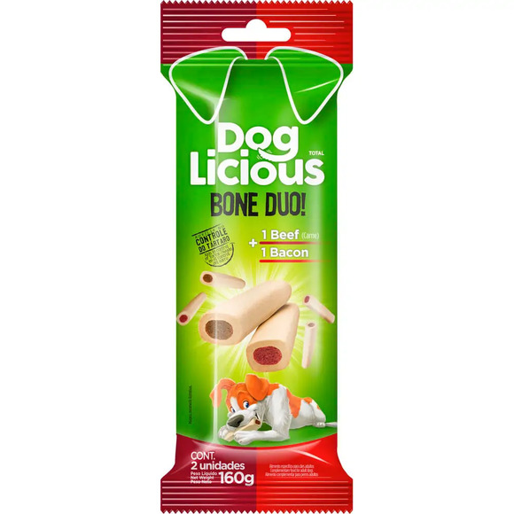 Petisco DogLicious Bone Duo Carne e BaconO Petisco DogLicious Bone Duo Carne e Bacon é um alimento específico para cães adultos. Ajuda no controle do tártato, enquanto o seu pet rói o petisco.Quer diversão em dobro? DogLicious Bone Duo é uma versão deliciosa que traz os sabores preferidos do seu amigão de uma só vez. Ele vai amar esta recompensa que, além de saborosa, colabora com o cuidado oral diário, mantendo os dentes limpos. Dê este sabor especial às suas brincadeiras.Na , você encontra o Petisco DogLicious Bone Duo Carne e Bacon com preço especial. Este produto não substitui o alimento completo, manter em lugar seco e ventilado, e uso proibido na alimentação de ruminantes.Quantidade Diária RecomendadaTamanho do CãoQuantidadeRaças Médias1 unidadeRaças Grandes1 unidadeRaças Gigantes2 unidadesNíveis de GarantiaDogLicious Bone BeefUmidade (máx.)250 g/kg (25%)Proteína Bruta (mín.)80 g/kg (8%)Extrato Etéreo (mín.)32 g/kg (3,2%)Matéria Fibrosa (máx.)35 g/kg (3,5%)Matéria Mineral (máx.)70 g/kg (7%)Cálcio (máx.)12 g/kg (1,2%)Cálcio (mín.)5.000 mg/kg (0,5%)Fósforo (mín.)3.000 mg/kg (0,3%)Sódio (mín)3.000 mg/kg (0,3%)Potássio (mín.)5.000 mg/kg (0,5%)DogLicious Bone BaconUmidade (máx.)250 g/kg (25%)Proteína Bruta (mín.)80 g/kg (8%)Extrato Etéreo (mín.)32 g/kg (3,2%)Matéria Fibrosa (máx.)35 g/kg (3,5%)Matéria Mineral (máx.)70 g/kg (7%)Cálcio (máx.)12 g/kg (1,2%)Cálcio (mín.)5.000 mg/kg (0,5%)Fósforo (mín.)3.000 mg/kg (0,3%)Sódio (mín)3.000 mg/kg (0,3%)Potássio (mín.)7.000 mg/kg (0,5%)IngredientesDogLicious Bone Beef: Arroz quebrado, Farinha de vísceras de aves, Amido de mandioca, Farinha de trigo, Óleo de soja degomado, Aditivo palatabilizante à base de frango, Hexametafosfato de Sódio (0,6%), Celulose em pó, Goma acácia, Açúcar, Cloreto de sódio (sal comum), Glicerina, Propilenoglicol, Sorbato de potássio, Cloreto de potássio, Ácido fosfórico, Propionato de cálcio, Aroma artificial de carne (0,05%), Corante natural caramelo, Dióxido de titânio, Aditivos antioxidantes (BHA, BHT).DogLicious Bone Bacon: Arroz quebrado, Farinha de vísceras de aves, Amido de mandioca, Farinha de trigo, Óleo de soja degomado, Aditivo palatabilizante à base de frango, Hexametafosfato de Sódio (0,6%), Celulose em pó, Goma acácia, Açúcar, Cloreto de sódio (sal comum), Glicerina, Propilenoglicol, Sorbato de potássio, Cloreto de potássio, Ácido fosfórico, Propionato de cálcio, Corante artificial vermelho 40, Corante artificial vermelho Bordeaux, Aroma natural de bacon (0,6%), Dióxido de titânio, Aditivos antioxidantes (BHA, BHT).