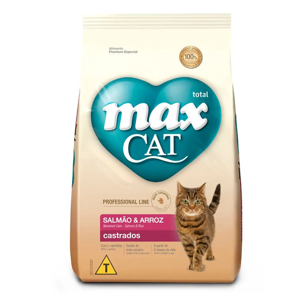 Ração Max Cat Castrados Professional Line Salmão e ArrozA Ração Max Cat Professional Line para gatos Castrados é produzida sem corantes e com ingredientes selecionados que são ideias no combate contra o ganho de peso do seu amigo após a castração, como a L-carnitina, que auxilia na queima de gordura. Conta também com ingredientes que ajudam diretamente na saúde do trato urinário, e na saúde do coração e visão do seu pet.Livre de corantes e rica em fibras, a Ração Max Cat Castrados Professional Line Salmão e Arroz ajuda na redução do odor das fezes do animal, proporcionando ao felino uma alimentação saudável e balanceada.Porque gato castrado tem que comer ração específica?A castração muda consideravelmente o ritmo do metabolismo, o que também influencia nas suas necessidades calóricas diárias. Por isso o gato, após castrado, precisa de um alimento que se adeque à essa nova realidade e evite que o animal tenha sobrepeso.Qual a diferença da ração para gato castrado?As rações para gatos castrados possuem menos calorias e gordura do que as rações normais, evitando que o animal tenha sobrepeso após a castração.Qual é a melhor ração para gato castrado?A oferece diversas opções de alimentos para gatos castrados com ótimo preço. Uma certamente vai se adequar às necessidades do seu felino.IngredientesArroz quebrado (2%), milho integral moído**, farelo de glúten de milho 60**, farinha de peixe salmão (1%), farinha de vísceras de aves, farelo de soja*, gordura de frango, carne mecanicamente separada de frango, linhaça integral moída, fosfato bicálcico, levedura seca de cervejaria, celulose em pó, cloreto de sódio (sal comum), cloreto de potássio, cloreto de Colina, propionato de cálcio, extrato de Yucca Schidigera (0,025%), taurina, l-carnitina, DL-metionina, óleo mineral, aditivo antioxidante (BHA, BHT), bissulfato de sódio, hidrolisado de fígado de frango e peixe, vitamina A, vitamina B12, vitamina C, vitamina D, vitamina E,selenito de sódio, ácido Fólico, ácido pantotênico, sulfato de cobre, sulfato Ferroso, iodato de calcio, óxido de manganês, vitamina B1, vitamina B2, vitamina B6, vitamina H, vitamina K, vitamina PP, óxido de zincoEnriquecimento mínimoVitamina A (min)168 UI/kgVitamina B12 (mín)20mcg/kgVitamina C (mín)20mg/kgVitamina D (min)700 UI/kgVitamina E (mín)450 UISelênio (min)0,3mg/kgÁcido fólico (min)1mg/kgÁcido pantotênico (mín)10mg/kgCobre (min)15mg/kgColina (min)2.200mgFerro (min)100mg/kgIodo (mín)2mg/kgManganes (mín)20mg/kgVitamina B1(min)6,5mg/kgVitamina B2 (mín)6,5mg/kgVitamina B6 (mín)8mg/kgVitamina H (mín)0,1mg/kgVitamina K (mín)1mg/kgVit (amina PP (mín)70mg/kgZinco (mín)120mg/kgNíveis de GarantiaUmidade (máx)120g/kg12%Protéina Bruta (mín)340g/kg34%Extrato Etéreo (mín)90g/kg9%Matéria Fibrosa (máx)55g/kg5,5%Matéria Mineral (máx)100g/kg10%Cálcio (máx)15g/kg1,5%Cálcio (mín)7000mg/kg0,7%Fósforo (mín)7000mg/kg0,7%Sódio (mín)3.000mg/kg0,3%Potássio (mín)6000mg/kg0,6DL-Metionina (mín)5700mg/kg0,57%L-carnitina (mín)200mg/kg0,02%