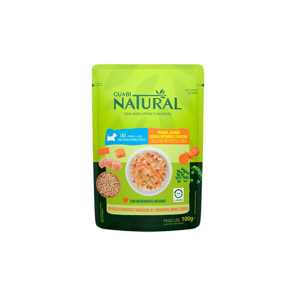 Ração Úmida Guabi Natural Cães Adultos Frango e CereaisSendo indicado para cães de todas as raças, a Ração Úmida Guabi Natural Cães Adultos Frango e Cereais é livre de ingredientes transgênicos, corantes e aromatizantes artificiais sendo 100% natural.Desenvolvido por especialistas em nutrição animal e aprovado por médicos-veterinários, o Sachê Guabi Natural para Cães é ideal para ser usado como complemento da alimentação do seu cachorro, podendo ser oferecido como petisco ou agrado. Com alto índice de umidade, o sachê é cozido a vapor e foi desenvolvido especialmente para proporcionar mais sabor oferecendo toda a qualidade e saúde que seu cachorro precisa.Encontre a maior variedade de alimentos para seu pet como a Ração Úmida Guabi Natural Cães Adultos Frango e Cereais com preço especial aqui na . Compre pelo site, app ou em uma de nossas lojas.Ingredientes:Carne de Frango, Carne de Salmão, Cenoura, Ervilha, Cevada em Grão, Grão de Sorgo, Cloreto de Sódio (Sal Comum), Água, Goma Xantana.Níveis de Garantia:Proteína Bruta (mín.)40g/kg4,0%Matéria Fibrosa (máx.)3500mg/kg0,35%Matéria Mineral (máx.)5000mg/kg0,50%Extrato Etéreo (mín.)5000mg/kg0,5%Cálcio (máx.)450mg/kg0,045%Cálcio (mín.)150mg/kg0,015%Sódio (mín.)150mg/kg0,015%Fósforo (mín.)150mg/kg0,015Umidade (máx.)945g/kg94,5%Energia metabolizável (mín.)20kcal/100g1 sachê