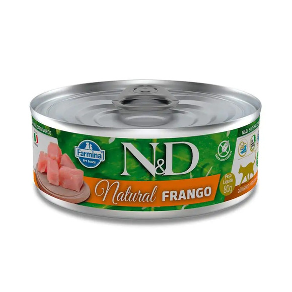 Ração Úmida N&.D Natural Gatos FrangoA Ração Úmida N&.D Natural foi desenvolvida com o propósito de agradar os gatos de todas as raças.Indicado como um complemento alimentar, a Ração N&.D para gatos é feita sem a adição de grãos e conservantes artificiais, sendo um alimento completamente natural.Encontre a maior variedade de alimentos para seu pet como a Ração Úmida N&.D Natural com preço especial aqui na . Compre pelo site, app ou em uma de nossas lojas.IngredientesCarne de frango (mín. 70%), caldo de frango.Níveis de garantiaUmidade (máx.)790g/kg79%Proteína Bruta (mín.)150g/kg15%Extrato Etéreo (mín.)10g/kg1%Matéria Fibrosa (máx.)4.000mg/kg0,4%Matéria Mineral (máx.)12g/kg1,2%Cálcio (mín.)600mg/kg0,06%Cálcio (máx.)3.000mg/kg0,3%Fósforo (mín.)300mg/kg0,03%Energia metabolizável900 Kcal/KgModo de usoA Ração N&.D fornece cerca de 25% da ingestão diária de calorias recomendada para um gato de 4 kg de peso corporal. A fim de manter a refeição diária completa e balanceada, recomenda-se usar junto com outros alimentos completos úmidos ou secos.Sempre deixe água fresca e limpa disponível. Mantenha a lata fechada em local fresco e seco, ao abrigo da luz solar.Após aberta, mantenha a lata refrigerada e use em até 48 horas.Quantidade recomendadaGatos de até 2,5kg1 lataGatos de 2,5kg a 5kg2 latasGatos com mais de 5kg3 latas