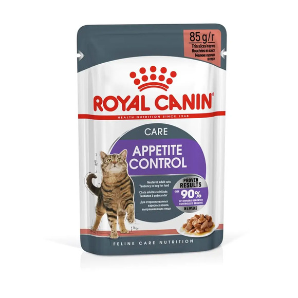 Ração Úmida Royal Canin Controle do Apetite Gatos AdultosA Ração Úmida Royal Canin Controle do Apetite Gatos Adultos é uma ração completa super premium indicada para gatos adultos com um apetite insaciável.Fórmula especialmente adaptada ajuda a limitar o comportamento de solicitação de alimento e o aumento excessivo de peso, também ajuda a promover a sensação de saciedade depois de comer, reduzindo em última análise a probabilidade de pedir por mais alimento.Com um teor moderado de gordura, o Sachê para Gatos ajuda a controlar o aumento excessivo de peso, enquanto o seu teor preciso de energia ajuda a manter em forma e saudável.Um estudo realizado pela Royal Canin mostrou que mais de 90% dos tutores de gatos participantes relataram que o comportamento de solicitação de alimento tinha sido controlado após apenas 4 semanas de utilização deste alimento.Ingredientes:Água, miúdos de frango, vísceras de suínos, vísceras de frango, fígado de suínos, farinha de arroz, plasma sanguíneo suíno, celulose, glúten de trigo, amido de milho, cloreto de potássio, carbonato de cálcio, tripolifosfato de sódio, sulfato de cálcio, carbonato de sódio, carragena, colecalciferol (vitamina D3), acetato de d-alfa tocoferol (vitamina E), cloridrato de tiamina (vitamina B1), riboflavina (vitamina B2), cloridrato de piridoxina (vitamina B6), cianocobalamina (vitamina B12), pantotenato de cálcio, biotina, ácido fólico, cloreto de colina, sulfato de zinco, sulfato de ferro, sulfato de cobre, sulfato de manganês, iodato de cálcio, zinco aminoácido quelato, cobre aminoácido quelato, manganês aminoácido quelato, taurina, L-carnitina.Níveis de Garantia:Umidade (Máx.)840 g/kg (84%)Proteína Bruta (mín.)62 g/kg (6,2%)Extrato Etéreo(mín.)2.000 g/kg (0,2%)Matéria Mineral (máx.)17 g/kg (1,7%)Matéria Fibrosa (máx.)20 g/kg (2%)Cálcio (máx.)8.680 g/kg (0,868%)Cálcio (mín.)1.320 mg/kg (0,132%)Fósforo (mín)960 mg/kg (0,096%)Sódio (mín)780 mg/kg (0,078%)Cloro (mín.)1.740 mg/kg (0,174%)Potássio (mín.)1.440 mg/kg (0,144%)Magnésio (mín.)70 mg/kg (0,007%)Taurina (mín.)420 mg/kg (0,042%)L-carnitina (mín.)25 mg/kg (0,0025%)Energia metabolizável737 Kcal/kgEnriquecimento mínimo por quilograma de produto(mín)Vitamina D3: 78 UI. Vitamina E: 24 UI. Vitamina B1: 4,2 mg. Vitamina B2: 0,6 mg. Vitamina B6: 0,6 mg. Vitamina B12: 1 mg. Niacina: 9,6 mg. Ácido pantotênico: 2,4 mg. Biotina: 0,036 mg. Ácido fólico: 0,18 mg. Colina: 126 mg. Zinco: 5,4 mg. Ferro: 1,8 mg. Manganês: 0,54 mg. Cobre: 1,38 mg. Iodo: 0,18 mg.Quantidade Diária RecomendadaPeso do gato Sachês por dia2kg24kg3 + 1/26kg4 + 1/2Seu pet muito mais saudável e feliz! Compre a Ração Úmida Royal Canin Controle do Apetite com preço incrível que só a pode oferecer! No Site, no App ou nas nossas lojas físicas.