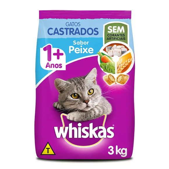 Ração Whiskas Gatos Castrados PeixeO alimento para gatos WHISKAS é nutricionalmente completo e balanceado, com um ótimo equilíbrio de vitaminas e minerais para ajudá-lo a fornecer os melhores cuidados para o seu gato adulto.As necessidades nutricionais do seu gato mudam ao longo do tempo. É por isso que o alimento seco para gatos WHISKAS 1+ anos é especialmente desenvolvido para gatos curiosos proporcionando a eles todos os nutrientes e energia necessários para explorar o mundo.Deixe as refeições ainda mais saborosas com a linha de WHISKAS Sachê que tem os sabores e texturas que seu gato irá amar.IngredientesFarinha de Peixe, Farinha de Carne e Ossos, Farinha de Subprodutos de Frango, Glúten de Milho*, Glúten de Trigo, Quirera de Arroz, Milho Integral Moído*, Farinha de Soja**, Gordura de Frango, Gordura Bovina, Farinha de Trigo, Polpa de Beterraba, Cenoura, Espinafre, Taurina, Metionina, Hidrolisado de Fígado de Frango, Vitaminas (A, B1, B2, B6, B12, D3, E, K3, Ácido Fólico, Niacina, Biotina, Cloreto de Colina, Ácido Pantotênico), Minerais (Cloreto de Potássio , Cloreto de Sódio – sal comum –, Iodato de Cálcio, Óxido de Zinco, Selenito de Sódio, Sulfato de Cobre, Sulfato de Manganês), Corante Natural Caramelo, B.H.T. (Hidróxido de Tolueno Butilado). Eventuais substitutivos: Óleo de Peixe, Celulose em pó, Sorgo Integral Moído, Cevada em Grão. *Espécies doadoras do gene: Agrobacterium tumefaciens, Bacillus thuringiensis, Streptomyces viridochromogenes, Zea mays, Sphingobium herbicidorovans, Dicossoma sp., Diabrotica firgifera, Thermoccocales spp, Bacillus substilis. **Espécies doadoras do gene: Agrobacterium tumefaciens, Bacillus thuringiensis, Streptomyces viridochromogenes, Arabidopsis thaliana, Delftia acidovorans, Pseudomonas fluorescens, Zea mays, Stenotrophomonas maltophilia, B.T. var Azawai e Kurstaqui, Agrobacterium sp