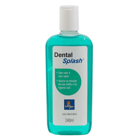 Solução Oral Dental Splash Pet SocietySolução de higiene oral que neutraliza mau hálito, para ser adicionada à água de bebida de cães e gatos. Retarda a formação e o acúmulo da placa bacteriana, além de neutralizar compostos que causam mau hálito.Auxiliar na higiene oral de cães e gatos com idade superior a 4 semanas.Solução de higiene oral que auxilia na manutenção da saúde oral de forma fácil e eficiente. Protege dentes e gengivas, contribuindo para evitar o acúmulo de sujidades na superfície dental, além de auxiliar na diminuição da halitose.Atóxico e não interfere na ingestão de água.Modo de usar:Diluir: 5 mL em 240 mL de água e troque a cada 24 horas.